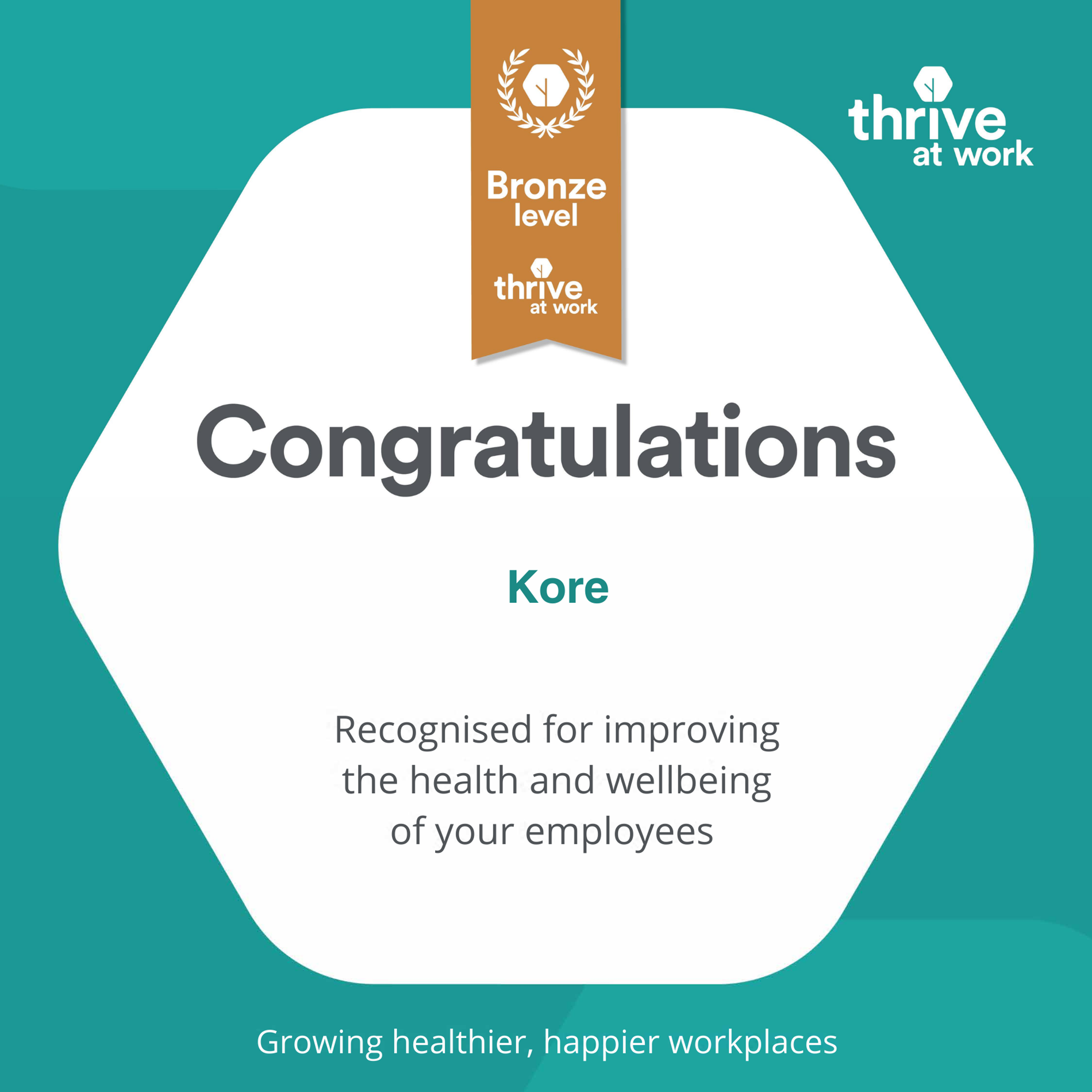 Kore has demonstrated a strong commitment to improving employee health and wellbeing by successfully completing the Foundation level of the Thrive at Work Workplace Wellbeing Award.