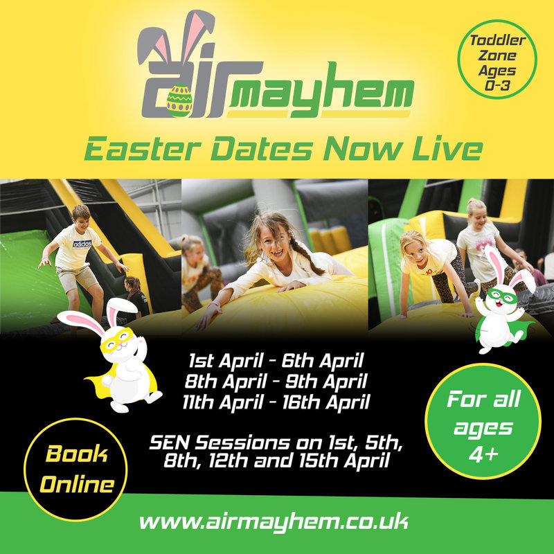 Air Mayhem sessions: open on dates ranging from 1st April – 16th April, 10:00-15:00.